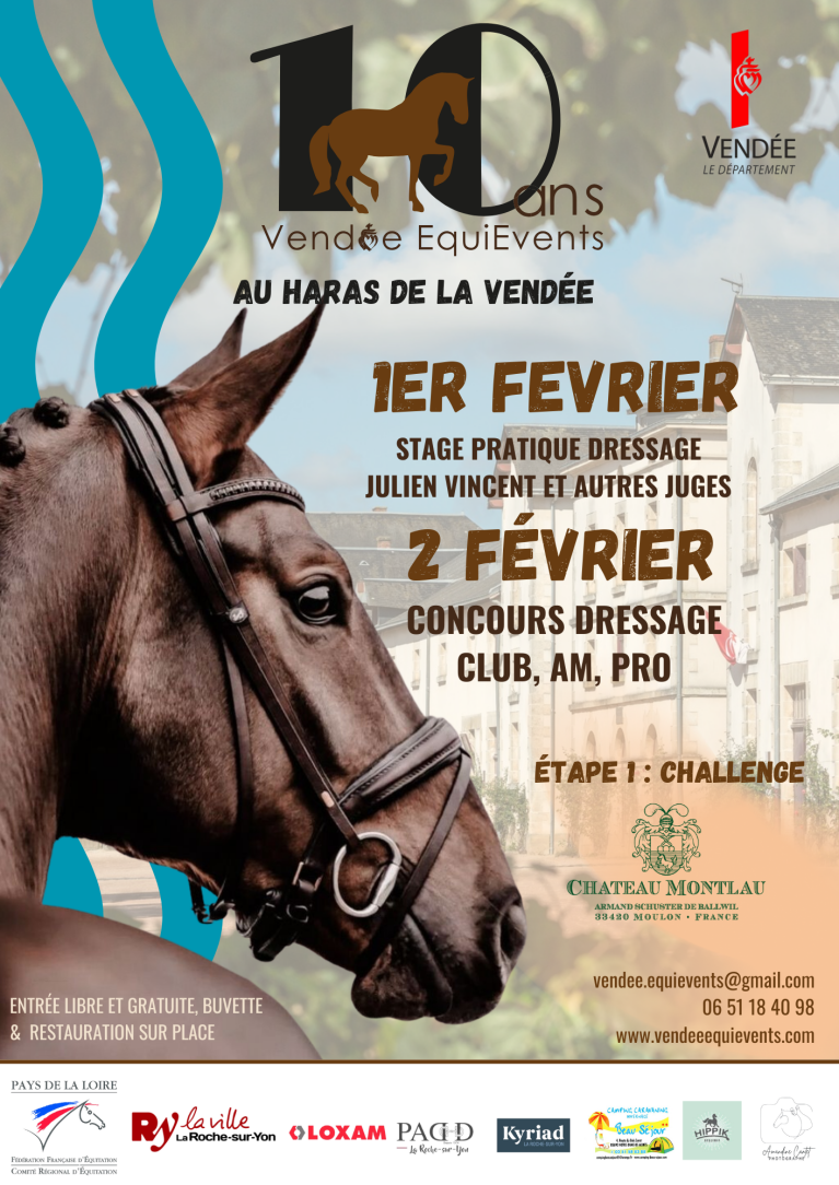 Vendée EquiEvents continue l'organisation pour la troisième année consécutive son Concours National de Dressage Amateur, Pro et Club dans le célèbre et magnifique cadre du Haras de la Vendée à La Roche sur Yon (85). Cette année le concours est le support du Championnat Régional de Dressage des Pays de la Loire. 4 titres de champions sont à décerner ! Plus d'une centaine de dresseurs venant de tout l'Ouest sont attendus pour ce grand week-end de spectacle ! Le dressage est la symbiose entre le cavalier et son destrier, l'entente parfaite est obligatoire pour démontrer les plus belles figures naturelles du cheval ! Venez admirer ce moment sportif et décontractant seul ou en famille, en connaisseur ou en néophyte.