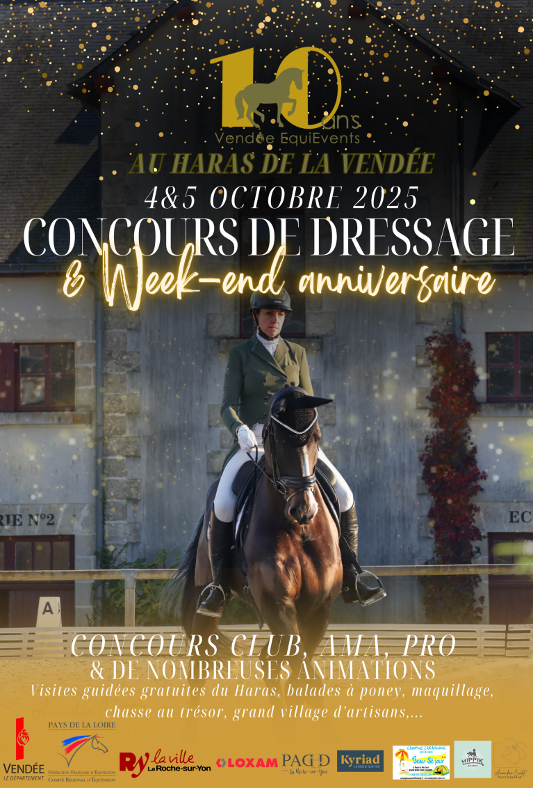 Les 4 et 5 octobre 2025, Vendée EquiEvents vous donne rendez-vous pour célébrer les 10 ans de son Concours National de Dressage Amateur, Pro et Club, organisé pour la neuvième année consécutive dans le cadre prestigieux du Haras de la Vendée à La Roche-sur-Yon (85).