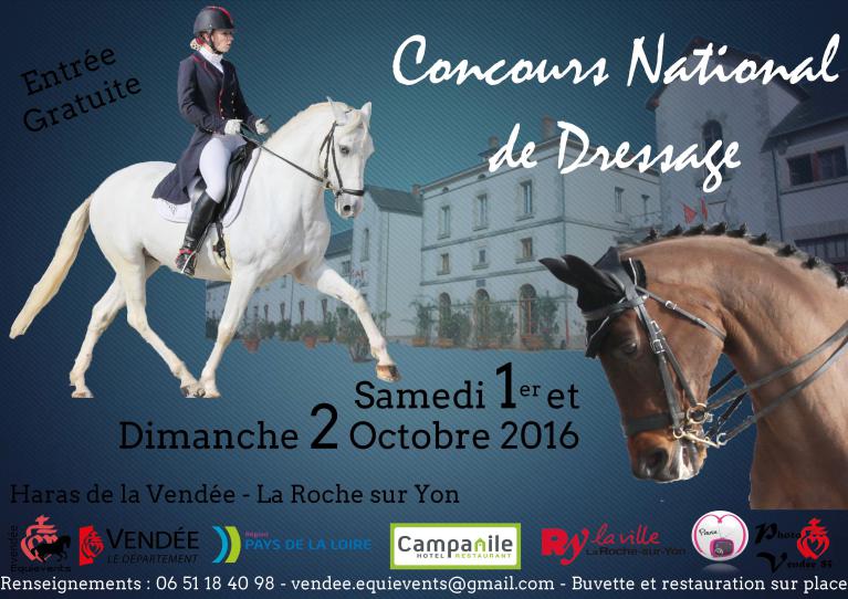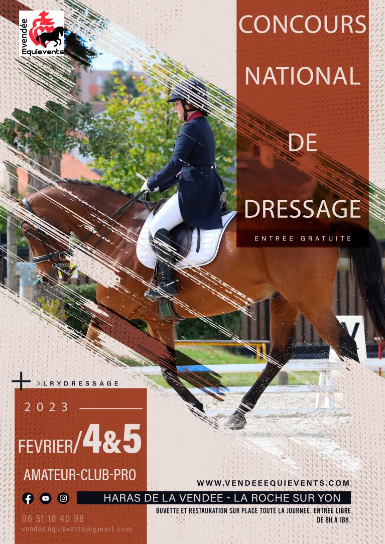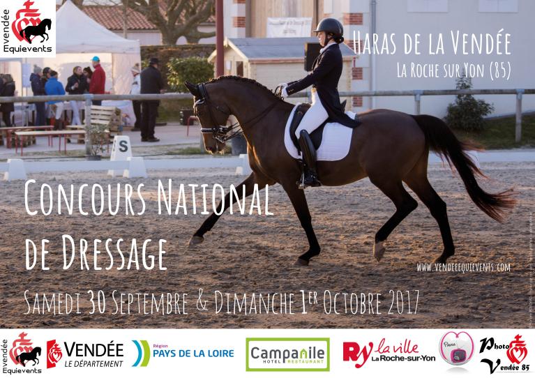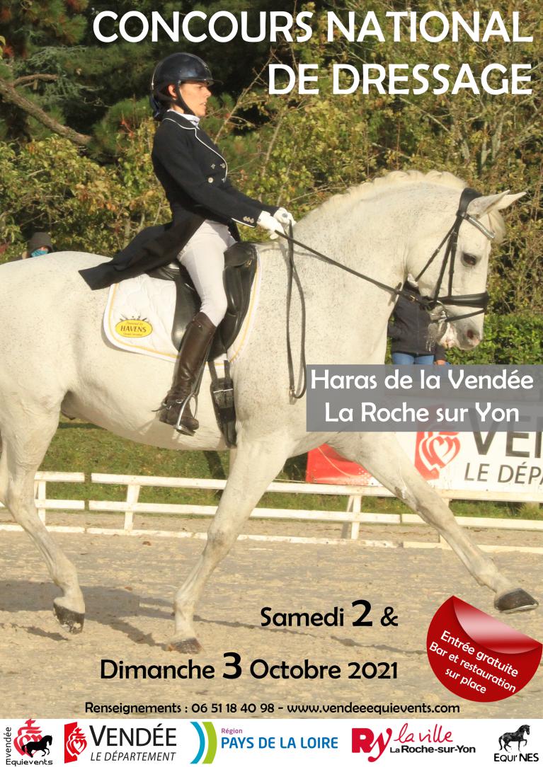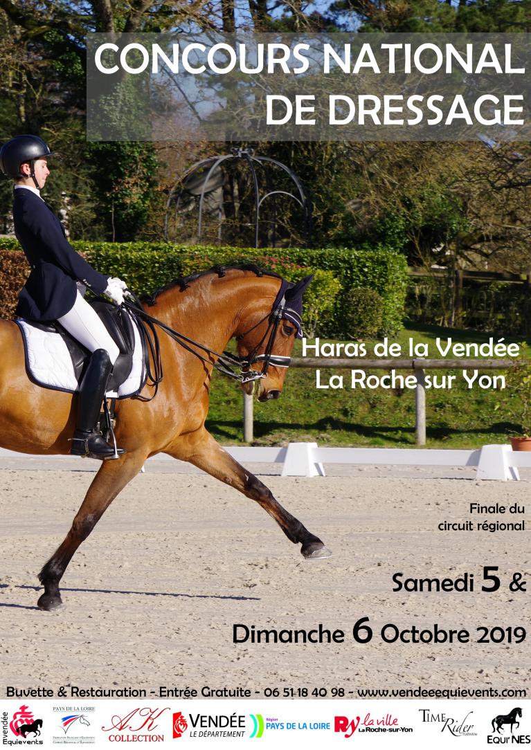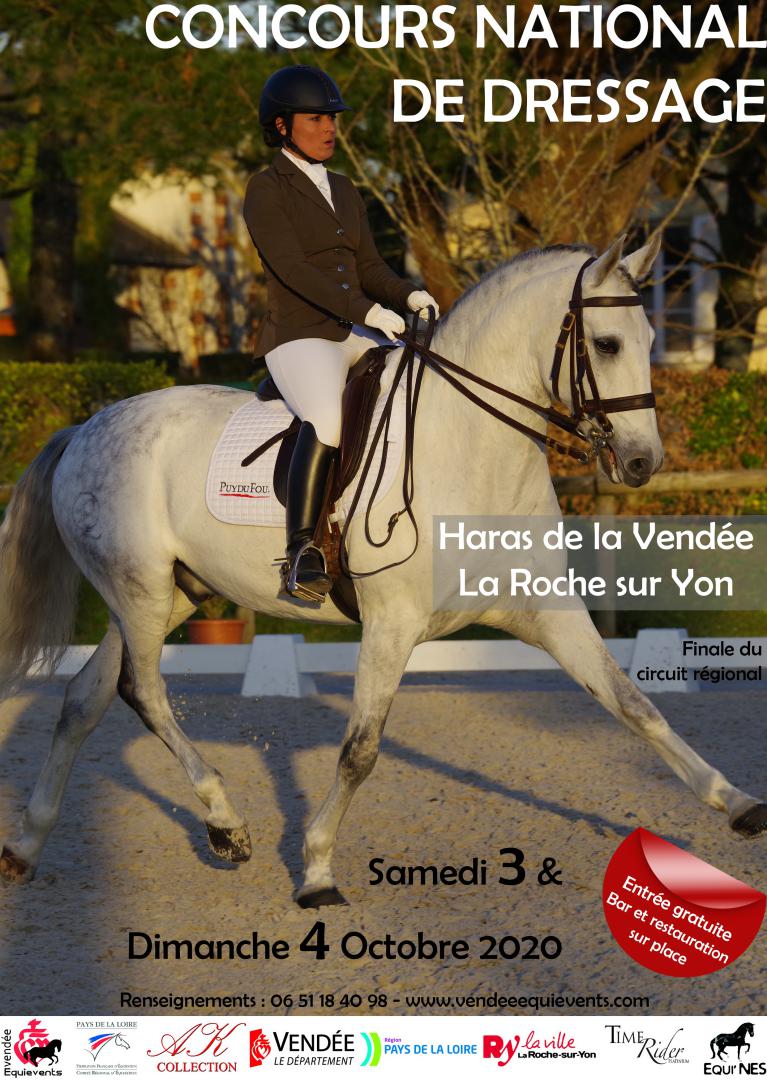 Vendée EquiEvents continue l'organisation pour la sixième année consécutive son Concours National de Dressage Amateur, Pro et Club dans le célèbre et magnifique cadre du Haras de la Vendée à La Roche sur Yon (85). Cette année le concours est la finale du circuit régional de Dressage des Pays de la Loire. Plus d'une centaine de dresseurs venant de tout l'Ouest sont attendus pour ce grand week-end de spectacle ! Le dressage est la symbiose entre le cavalier et son destrier, l'entente parfaite est obligatoire pour démontrer les plus belles figures naturelles du cheval ! Venez admirer ce moment sportif et décontractant seul ou en famille, en connaisseur ou en néophyte.
